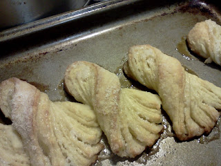This also happens to be a recipe that I've made twice before. Each time I make it, I swear that I'll never make it again. The dough gets sticky and starts splitting because you are rolling vanilla sugar between each layer. It comes apart and you get frustrated and throw your hands up.